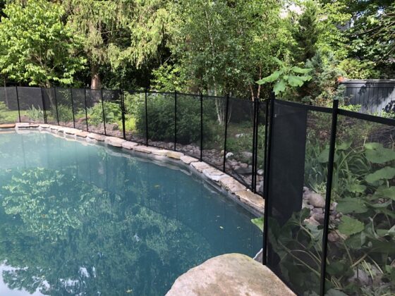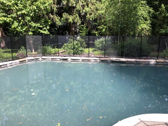 This fence is in Coventry, Rhode Island, in Kent County. If you’ll notice, the homeowners originally put a wrought iron fence around the door to the back yard. That solution was fine for a couple of years, but as the child gets older, they outgrow that. It is best to surround the pool and separate it from the house and yard so the child can exit the back door and play in the yard independently.